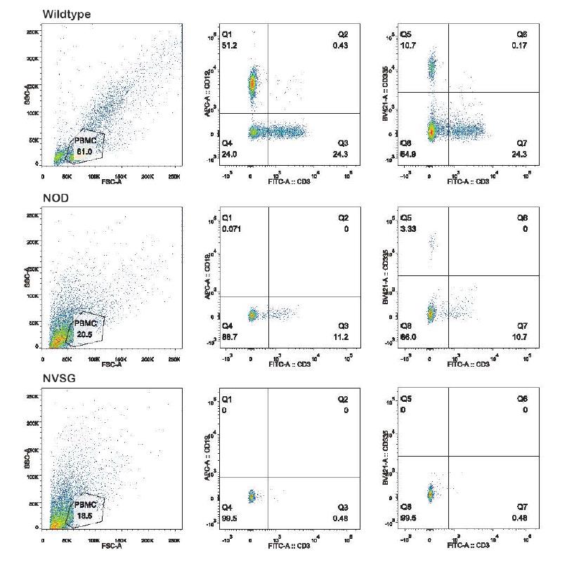 流式分选及统计结果对比显示:NVSG 鼠的 T、B、NK 细胞表现为高度缺失。